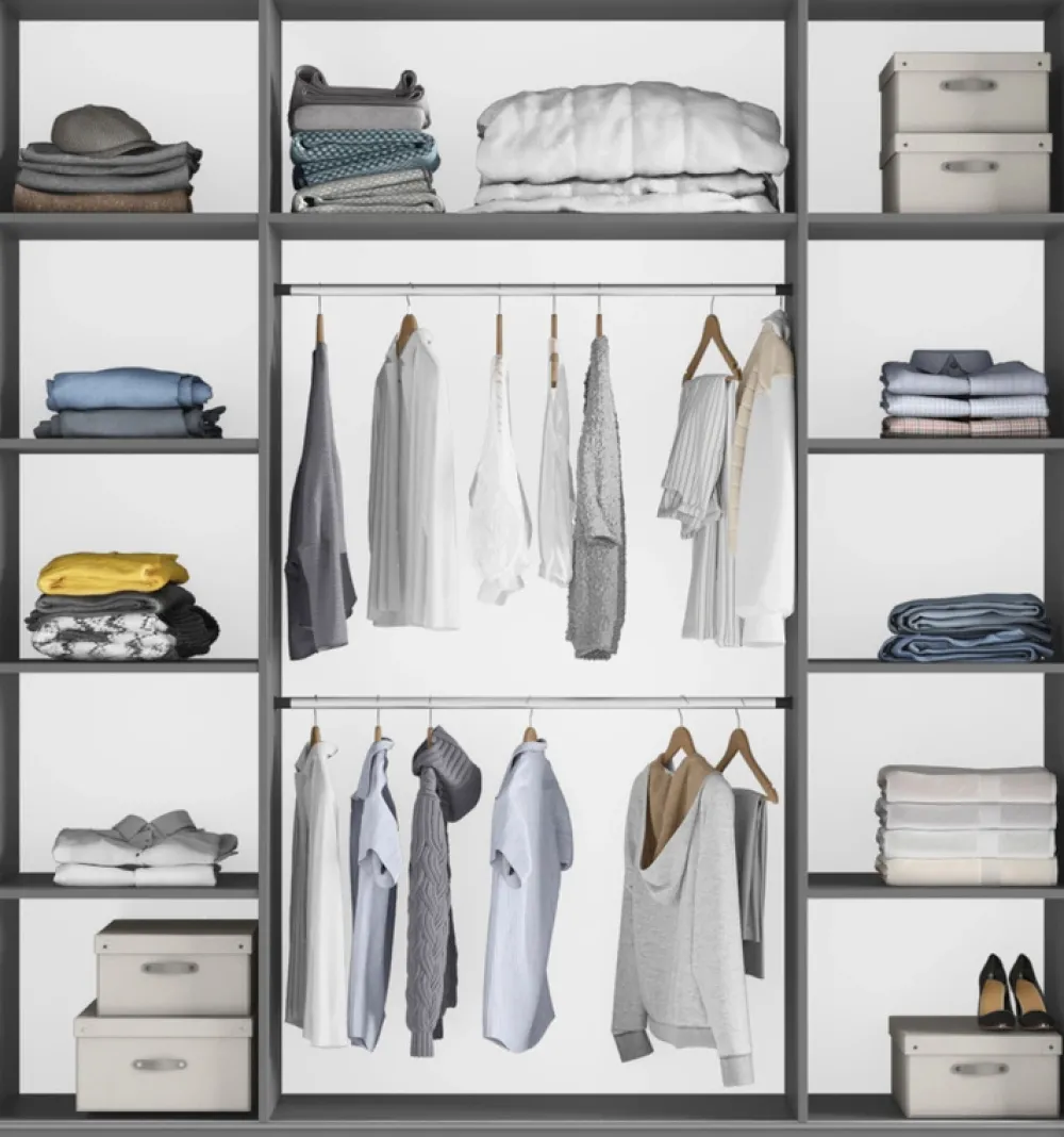 Środkowa część szafy została zaprojektowana z myślą o odzieży wiszącej. Znajduje się tam dodatkowa półka oraz dwa drążki na wieszaki, które umożliwiają przechowywanie płaszczy, sukienek, marynarek czy koszul. Drążki zapewniają, że Twoje ubrania pozostają w idealnym stanie, bez zagnieceń, co sprawia, że są zawsze gotowe do założenia.
