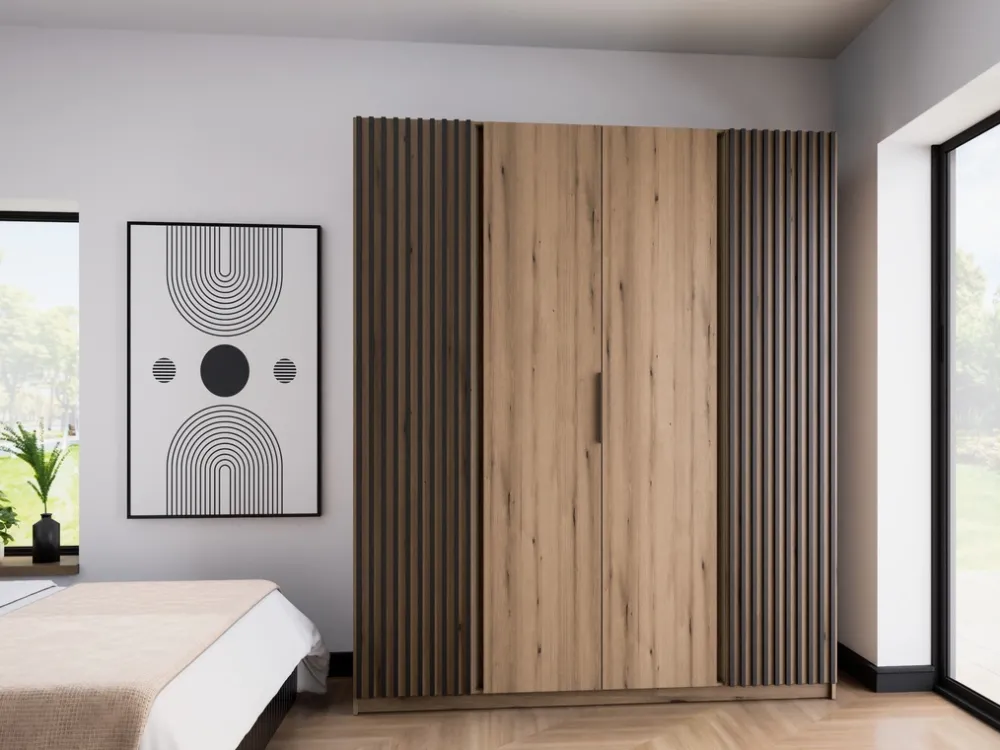 Korpus oraz front szafy z lamelami wykonano z wysokiej jakości płyty laminowanej o grubości 16 mm, co gwarantuje trwałość i solidność mebla. Boczne drzwi szafy wyposażono w eleganckie lamele, które nadają całości nowoczesnego i eleganckiego charakteru, a jednocześnie wprowadzają unikalny akcent do wnętrza sypialni.