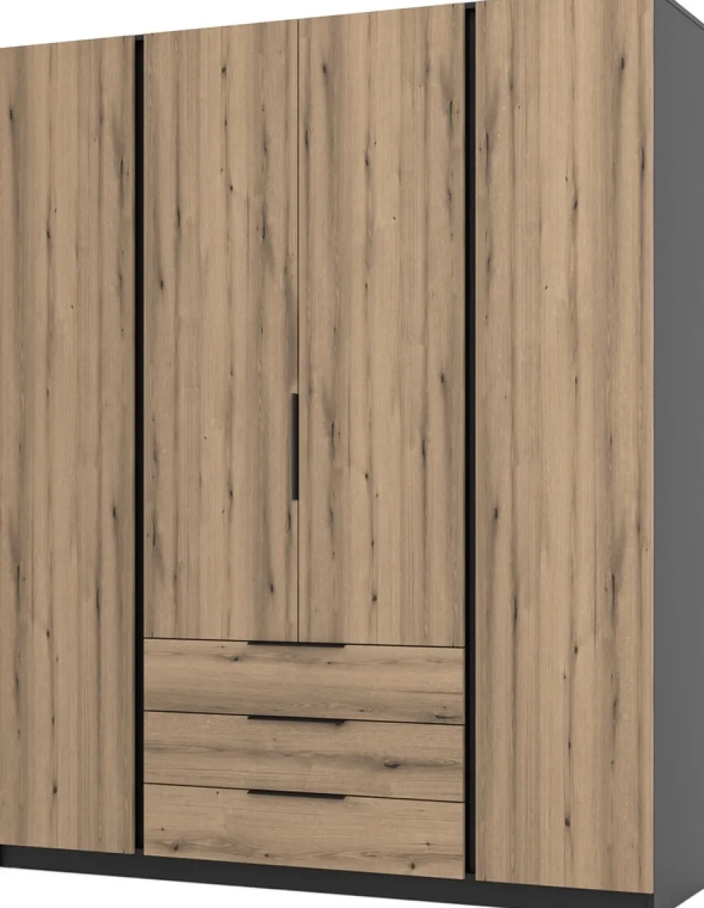 U dołu szafy umieszczono trzy przestronne szuflady, które poruszają się na płynnych prowadnicach kulkowych. To idealne miejsce na przechowywanie rzeczy, które wymagają łatwego dostępu, jak ręczniki czy pościel. Czarne, aluminiowe uchwyty są nie tylko funkcjonalne, ale i stanowią elegancki akcent, podkreślający nowoczesny charakter mebla.