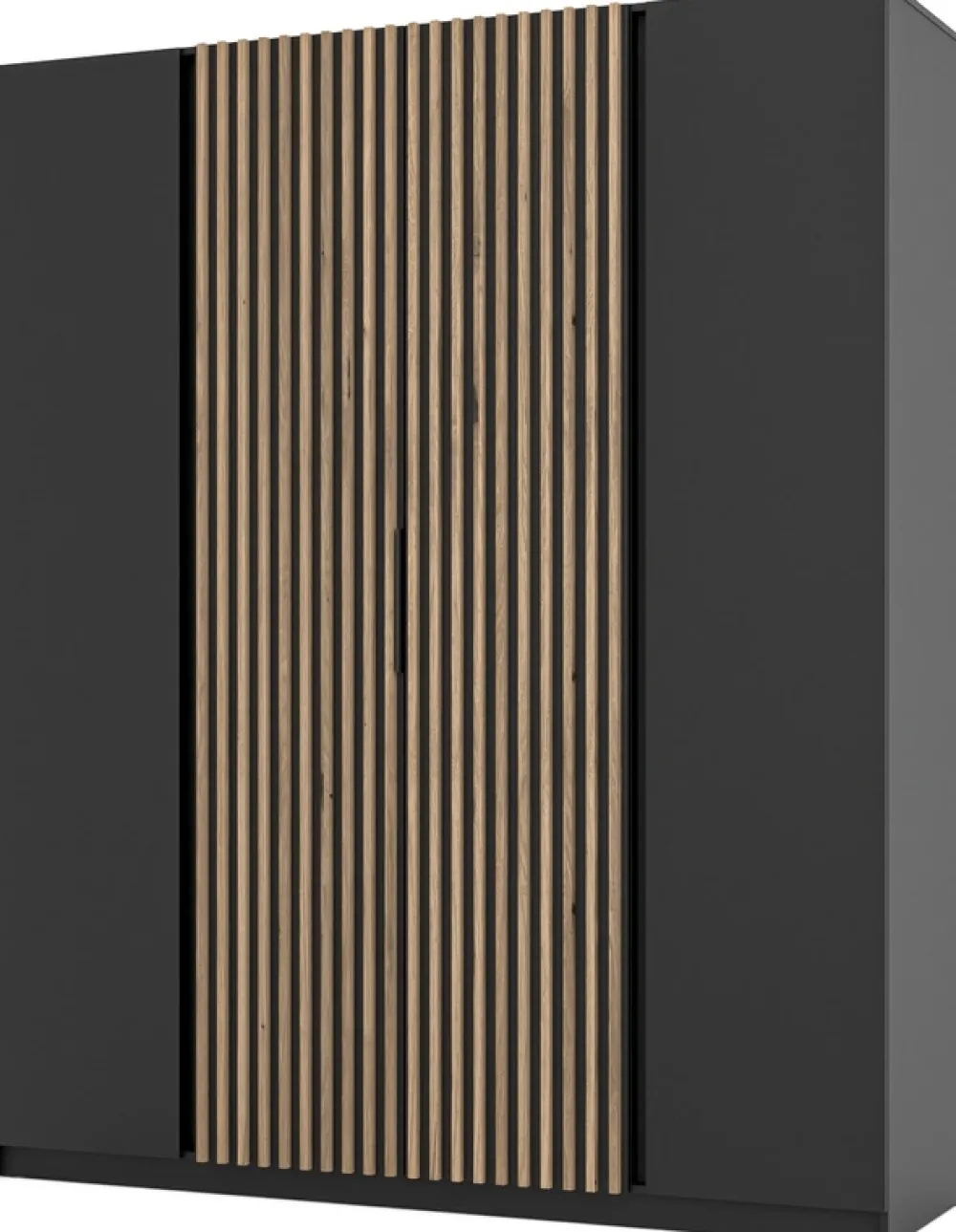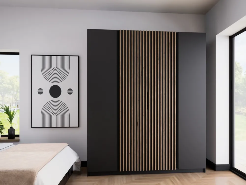Korpus oraz front szafy z lamelami do sypialni wykonano z wysokiej jakości płyty laminowanej o grubości 16 mm, co zapewnia trwałość i solidność mebla. Charakterystycznym elementem są dwa środkowe drzwi z lamelami, które nadają szafie nowoczesny i stylowy wygląd, wyróżniając ją spośród innych mebli.