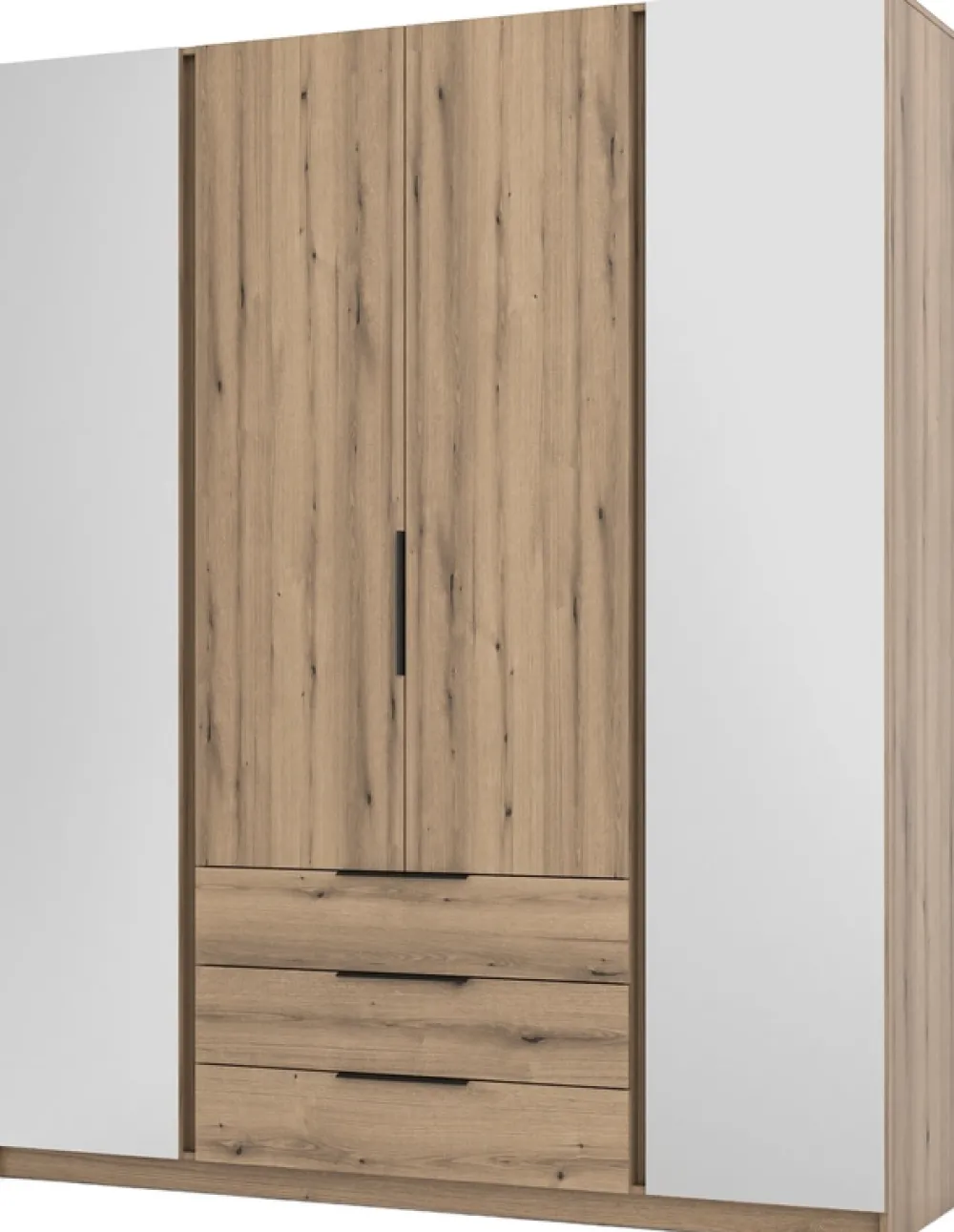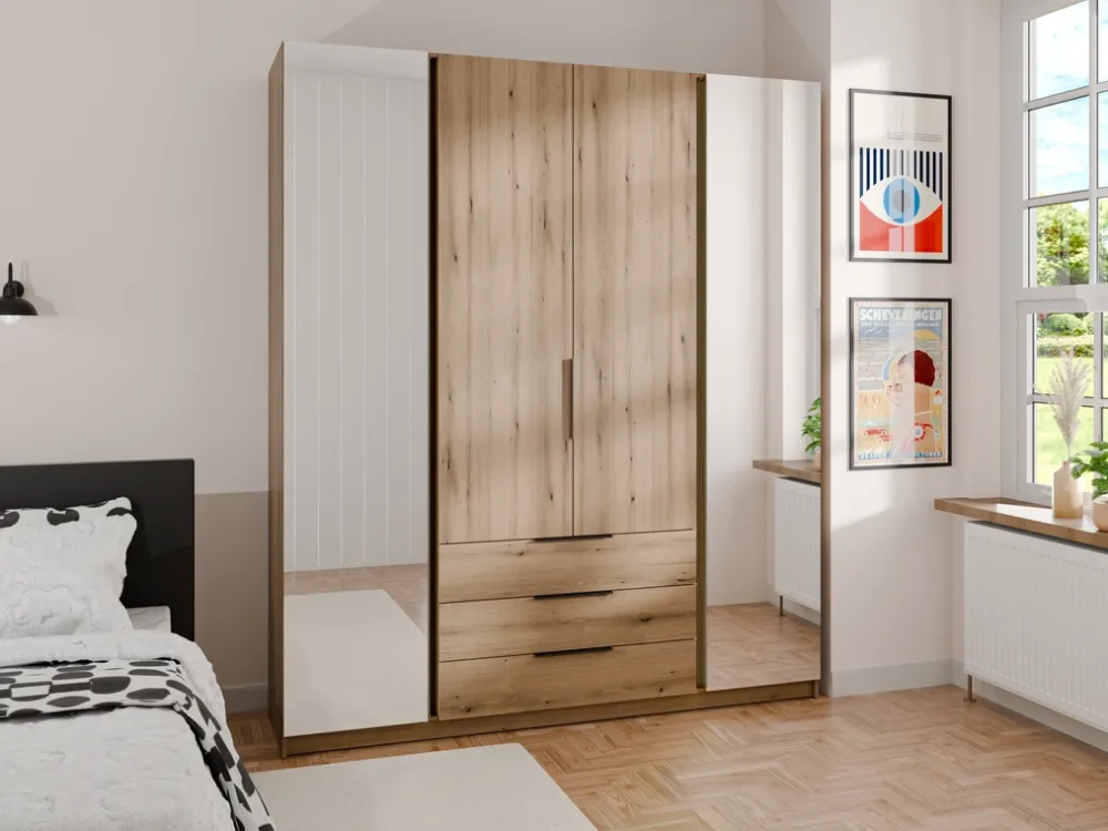 Szafa została zaprojektowana z myślą o wygodzie użytkowania i optymalnym wykorzystaniu przestrzeni. Cztery drzwi, osadzone na solidnych zawiasach puszkowych, gwarantują łatwy dostęp do wnętrza szafy. Dodatkowo trzy szuflady poruszające się na prowadnicach kulkowych umieszczone są w dolnej części, oferując przestrzeń na drobniejsze przedmioty i akcesoria, co ułatwia organizację i segregację zawartości.