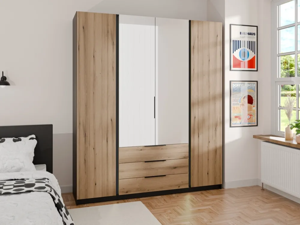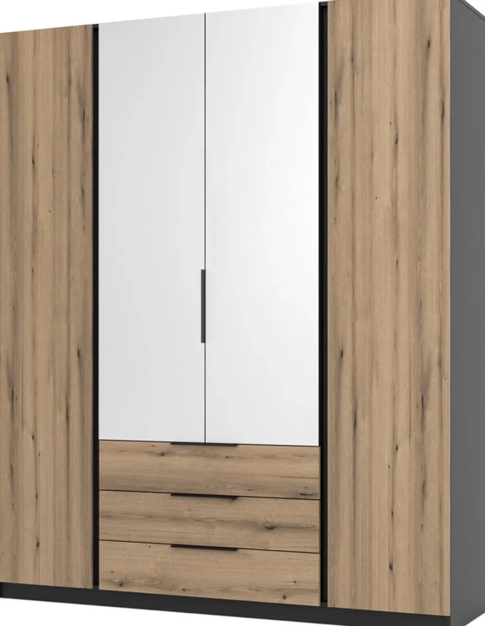 Centralną atrakcją tej szafy są dwa lustra umieszczone na środkowych drzwiach, które optycznie powiększają przestrzeń i dodają jej lekkości. Lustro to nie tylko praktyczny element, ale również stylowy akcent, który świetnie komponuje się z każdym stylem wnętrza.