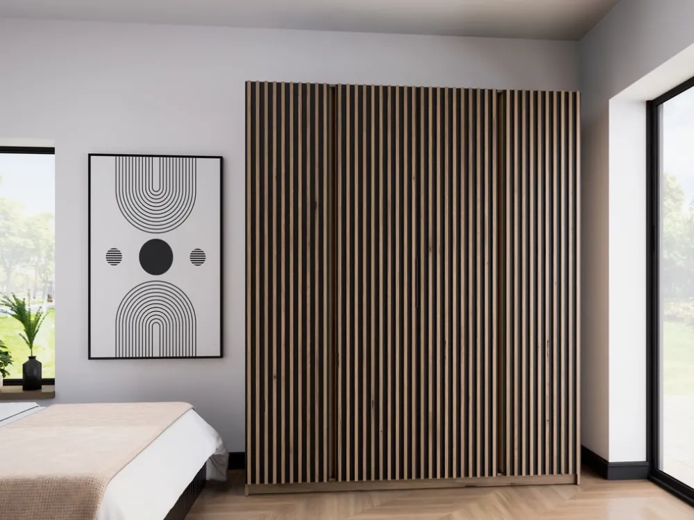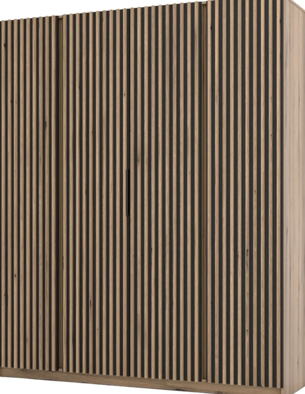 - Szafa do sypialni KARAT posiada cztery drzwi z lamelami. W środku znajduje się 13 półek oraz metalowy drążek na wieszaki. Uchwyty szafy wykonano z aluminium w czarnym kolorze, korpus oraz front wykonano z płyty laminowanej 16 mm.