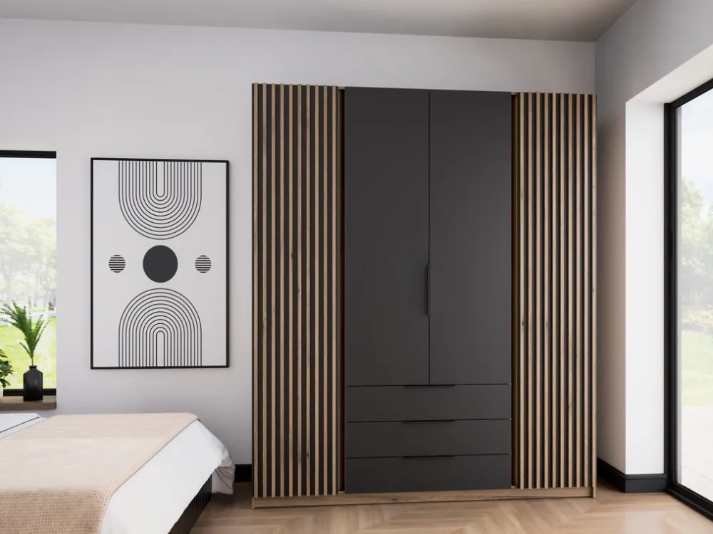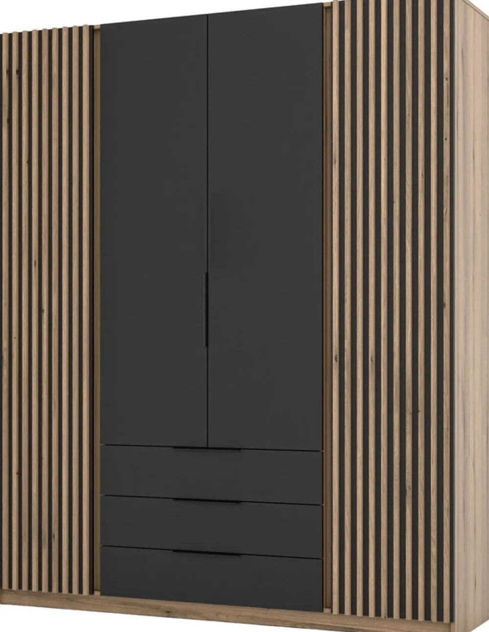 Odkryj nową jakość przechowywania z naszą najnowszą szafą o szerokości 200 cm KARAT, idealną do każdego wnętrza, gdzie styl idzie w parze z funkcjonalnością. Ta elegancko zaprojektowana szafa została wyposażona w cztery drzwi, z czego lewe oraz prawe z lamelami, które dodają charakteru każdemu pomieszczeniu. Drzwi zostały osadzone na zawiasach puszkowych, co gwarantuje płynne i ciche otwieranie.