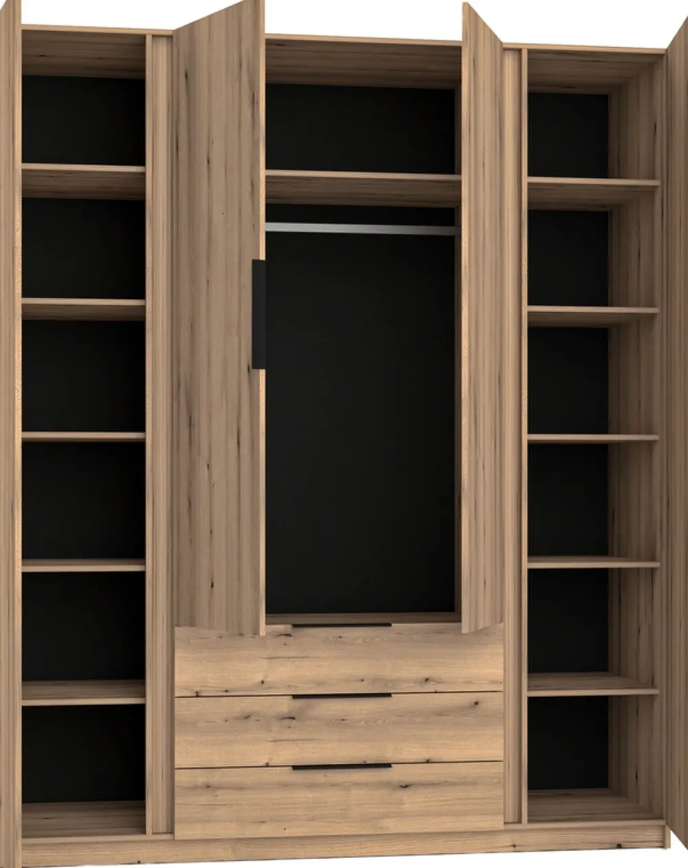 Wewnątrz szafy znajdują się trzy głębokie szuflady na prowadnicach kulkowych, które zapewniają łatwy dostęp do przechowywanych przedmiotów bez zacinania. Pod szufladami, po obu stronach szafy, rozmieszczono pięć przestronnych półek, idealnych do segregacji ubrań i innych akcesoriów, co pozwala na utrzymanie porządku i łatwość w odnajdywaniu potrzebnych rzeczy.