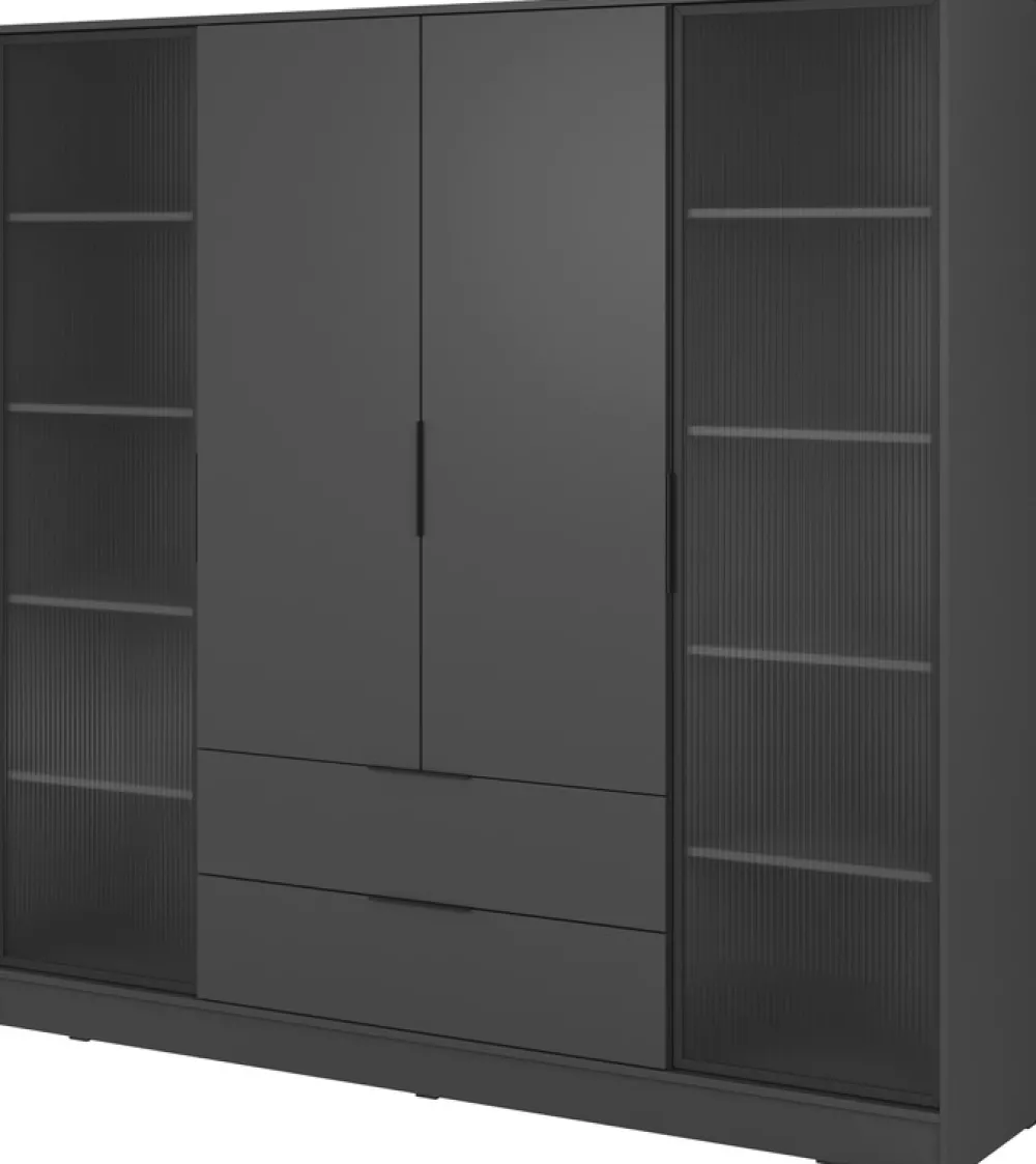 Ta wyjątkowa szafa z witryną KAMIS to idealne rozwiązanie dla osób, które cenią sobie styl oraz funkcjonalność. Przemyślany układ pozwala na wygodne przechowywanie zarówno ubrań, jak i przedmiotów codziennego użytku. Po obu stronach szafy znajdują się przeszklone drzwi, za którymi ukryto aż pięć pojemnych półek. To idealne miejsce na ekspozycję ozdobnych przedmiotów, książek czy dekoracji, które dodadzą wnętrzu unikalnego charakteru.