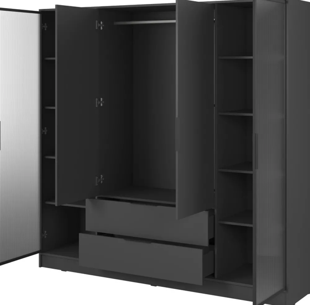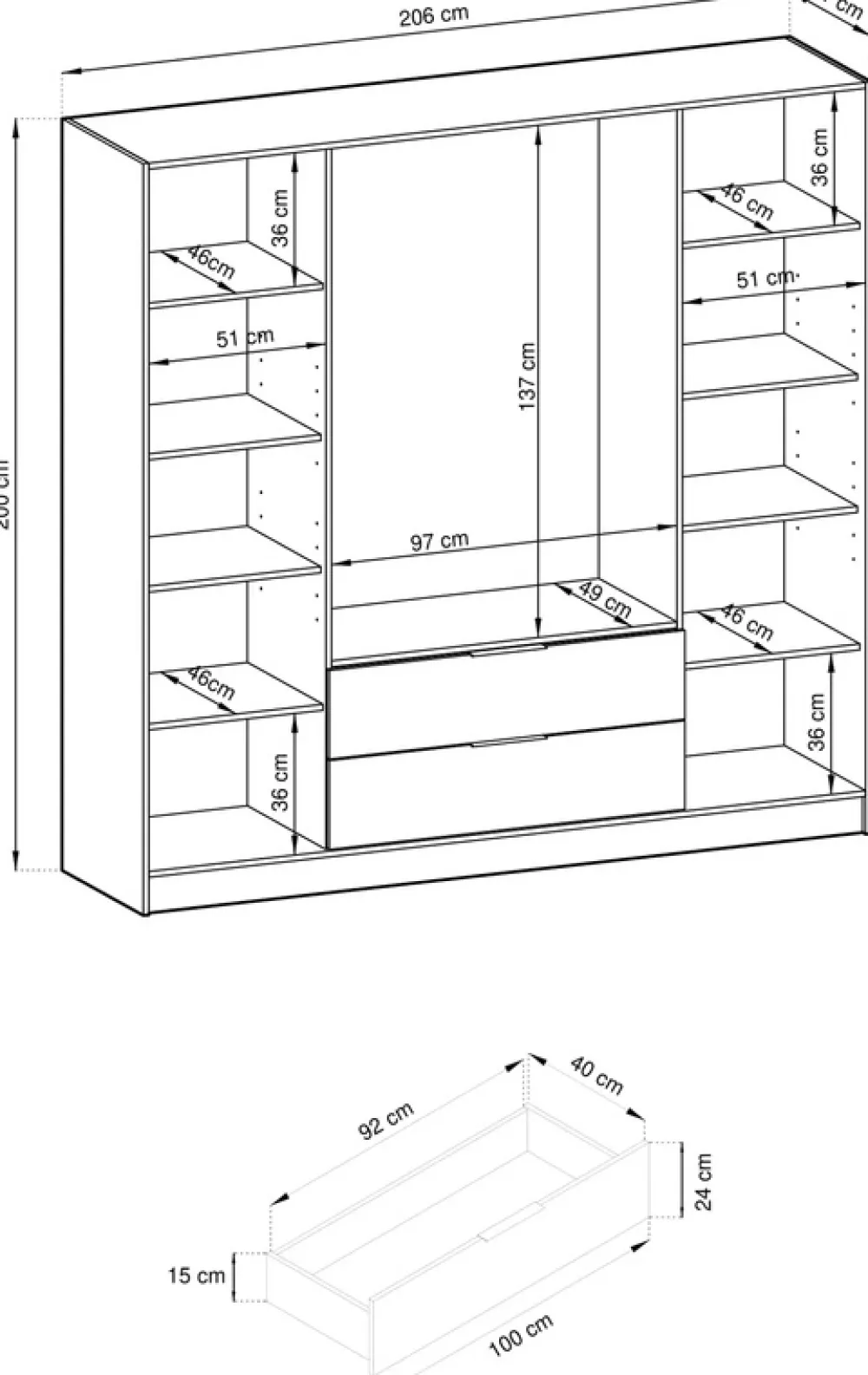 - W zestawie dołączamy cztery półki i drążek na wieszaki, dzięki czemu o rozmieszczeniu elementów w centralnej części można zdecydować podczas montażu.