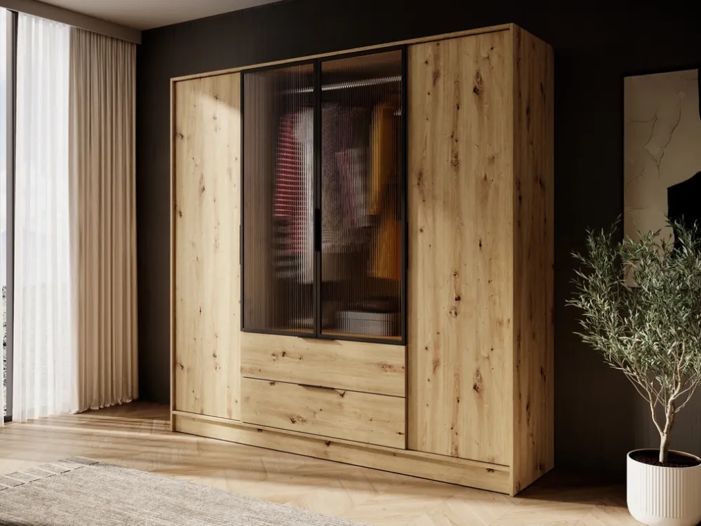 Centralna część szafy zachwyca parą przeszklonych drzwi, za którymi umieszczono drążek na wieszaki lub opcjonalnie trzy półki. Ta uniwersalna przestrzeń pozwala na dopasowanie szafy do indywidualnych potrzeb – możesz powiesić tam płaszcze, marynarki lub wybrać dodatkowe półki, by zyskać miejsce na przedmioty, które chcesz mieć pod ręką i w zasięgu wzroku.