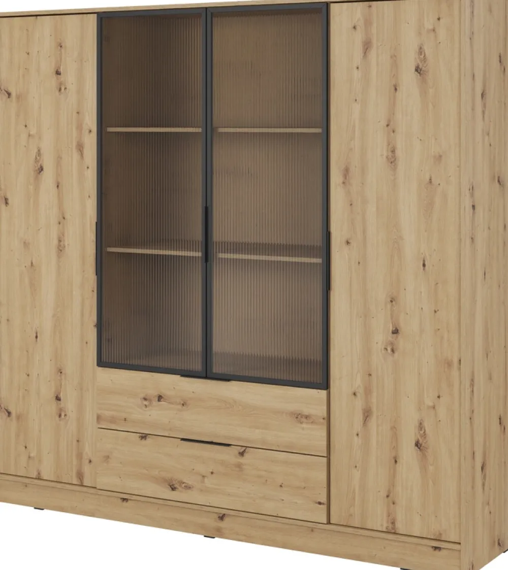 Szafa z witryną KAMIS to doskonały wybór dla osób, które chcą wprowadzić do swojego wnętrza nie tylko praktyczność, ale i wyjątkowy design. Przestronny układ zapewnia wygodę i elastyczność w przechowywaniu różnych przedmiotów. Po prawej i lewej stronie znajdują się pełne drzwi, za którymi kryje się po pięć pojemnych półek – idealnych na ubrania, dokumenty czy akcesoria, które wymagają estetycznego przechowywania.