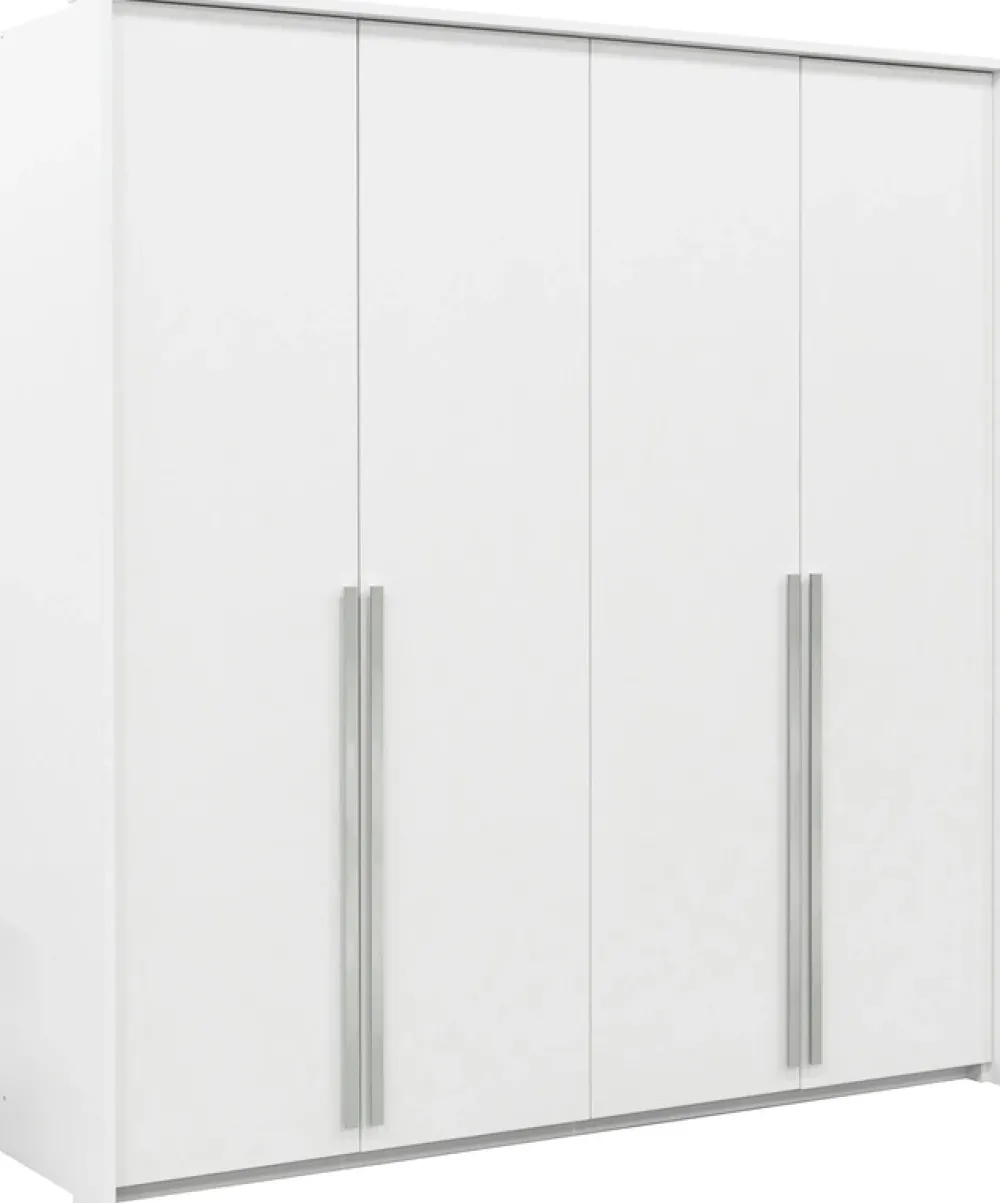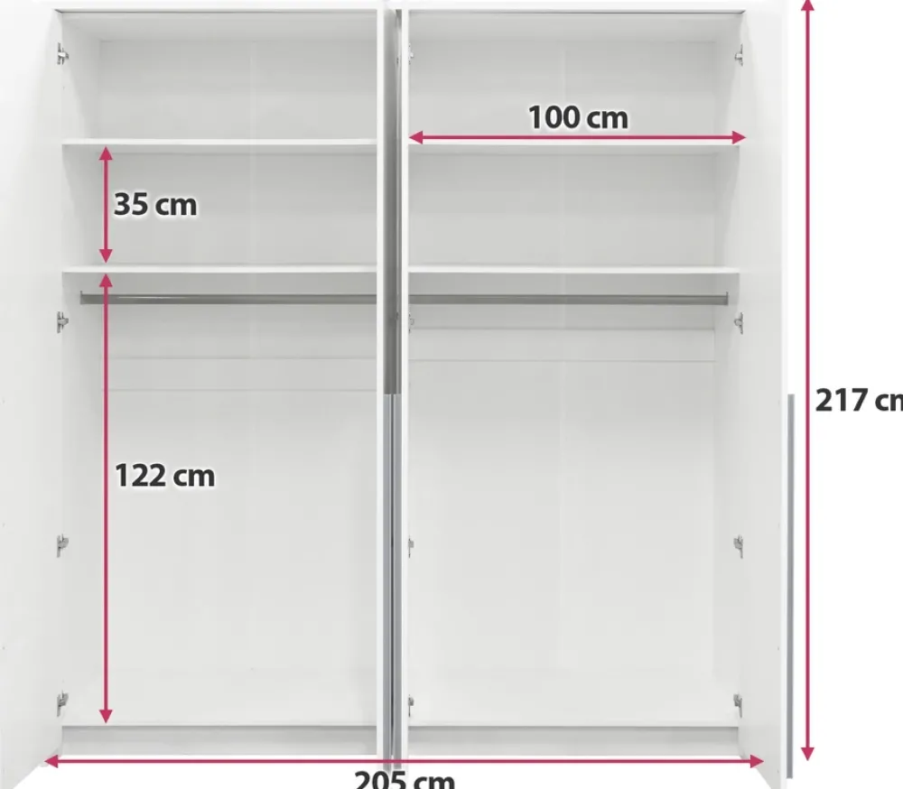 - Nowoczesna szafa GENEWA posiada cztery drzwi, za każdą parą drzwi znajdują się dwie półki oraz aluminiowy drążek na wieszaki. Drzwi szafy posiadają zawiasy puszkowe wzbogacone o mechanizm cichego domyku. Uchwyty doskonale zdobią konstrukcję.