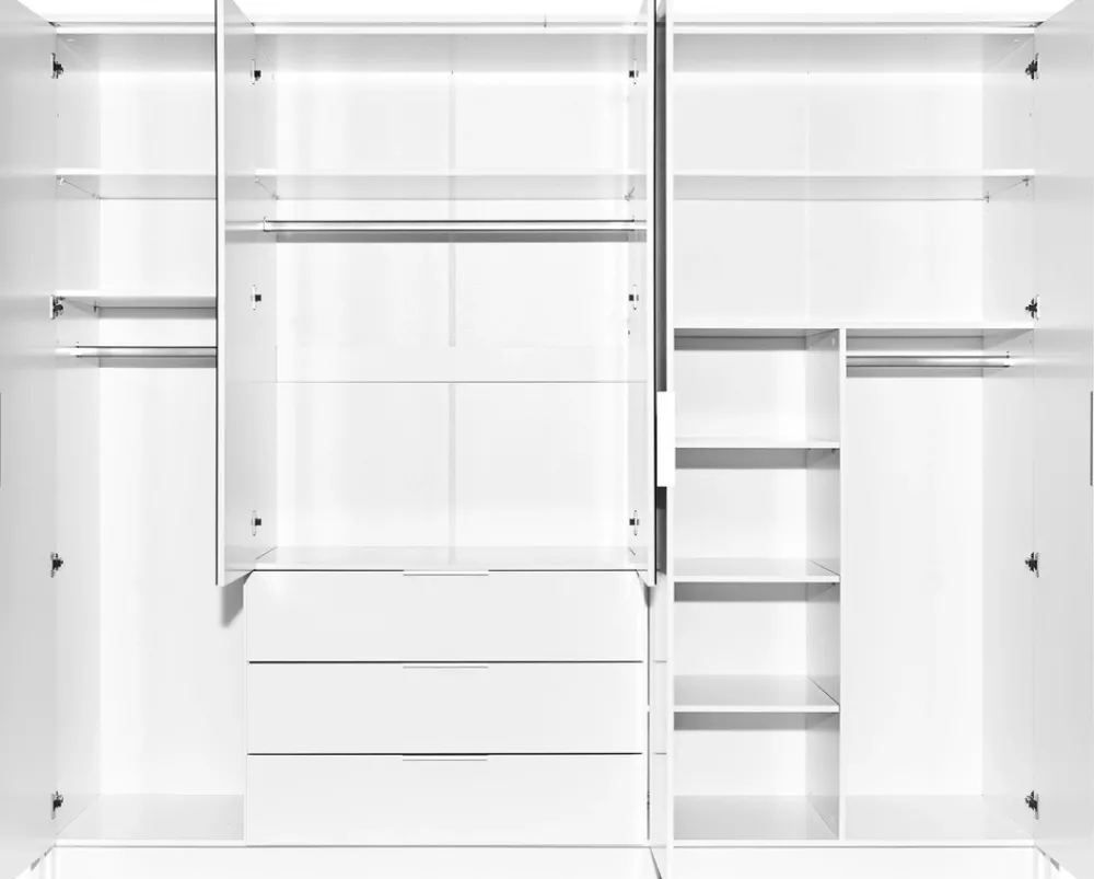 Szafa uchylna o szerokości 255 cm TETRA to wyjątkowy mebel, który łączy w sobie imponującą przestrzeń do przechowywania z eleganckim, nowoczesnym designem. Dzięki pięciu drzwiom oraz przemyślanemu układowi wnętrza zapewnia maksymalną funkcjonalność, jednocześnie dodając wnętrzu stylu i harmonii.