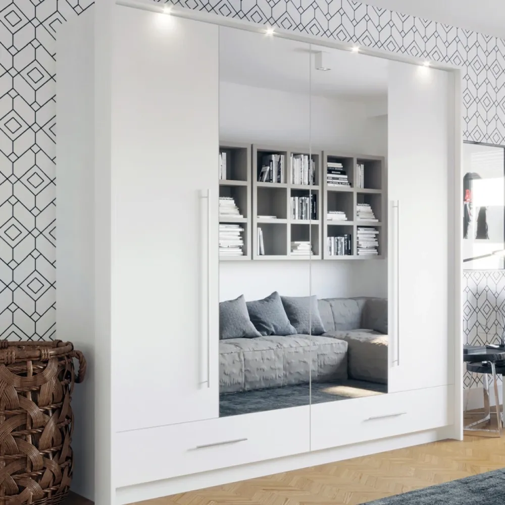 Szafa przesuwna o szerokości 209 cm TALOR to doskonałe połączenie nowoczesnej funkcjonalności i elegancji, które wprowadza do wnętrza przestronność i wygodę użytkowania. Dzięki harmonijkowemu systemowi otwierania drzwi, szafa zapewnia płynny dostęp do całej swojej zawartości, co czyni ją wyjątkowo praktycznym rozwiązaniem nawet w mniejszych przestrzeniach.