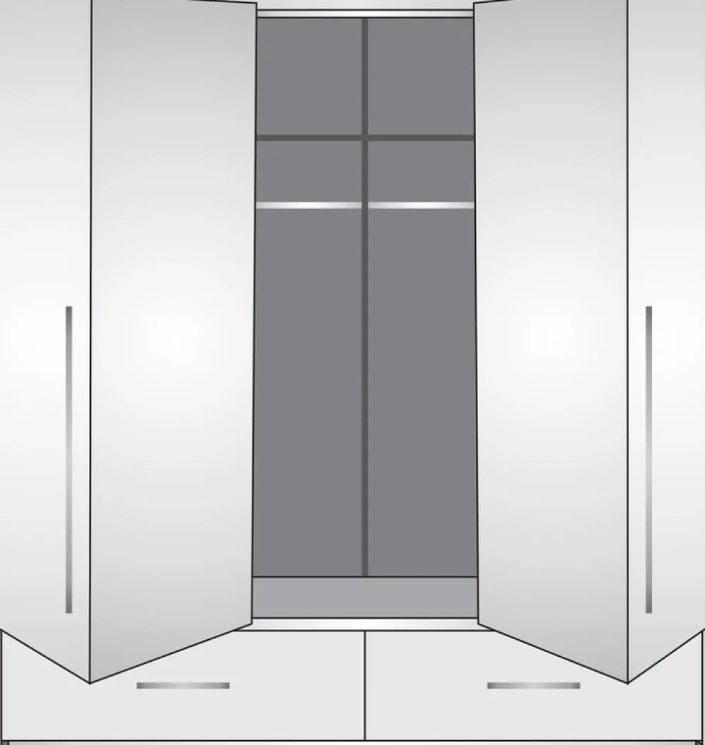 - Szafa TALOR posiada cztery drzwi z harmonijkowym systemem otwierania, za którymi znajdują się liczne półki oraz dwa aluminiowe drążki na wieszaki. Szafa posiada dwie pojemne szuflady na bieliznę i akcesoria. Obrzeża wykończone okleina PCV.