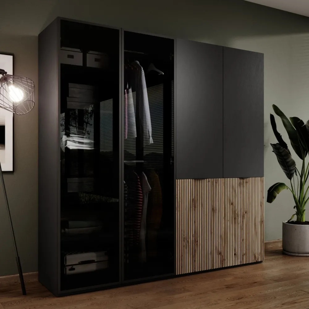 Moduły można ustawić obok siebie w dowolnej kolejności: szkło może być po prawej lub lewej stronie. Czarny korpus nadaje całości minimalistycznej elegancji, frezy w dekorze dębu wotan wprowadzają przytulny akcent, a moduł szklany optycznie otwiera przestrzeń.