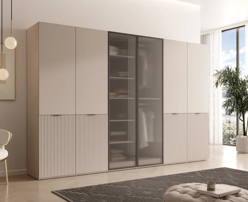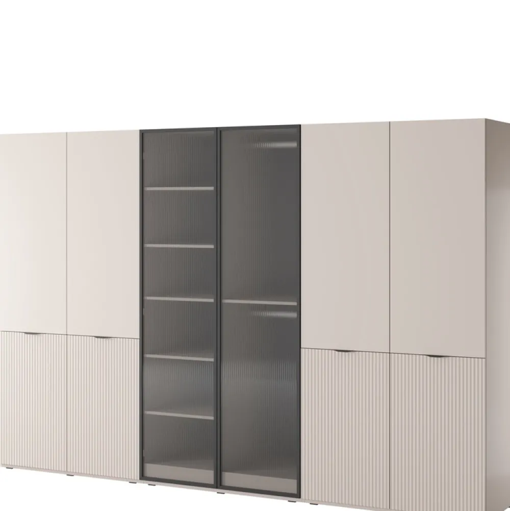 Zestaw SIGMA łączy minimalistyczne formy z różnorodnością wykończeń, dzięki czemu tworzy dynamiczną, a jednocześnie spójną kompozycję. Przeszklony segment dodaje lekkości i wizualnego powiększenia przestrzeni, podczas gdy frezowane moduły nadają całości ciepła i elegancji. Idealne rozwiązanie dla osób, które cenią estetykę i potrzebują dużej, dobrze zorganizowanej przestrzeni do przechowywania.