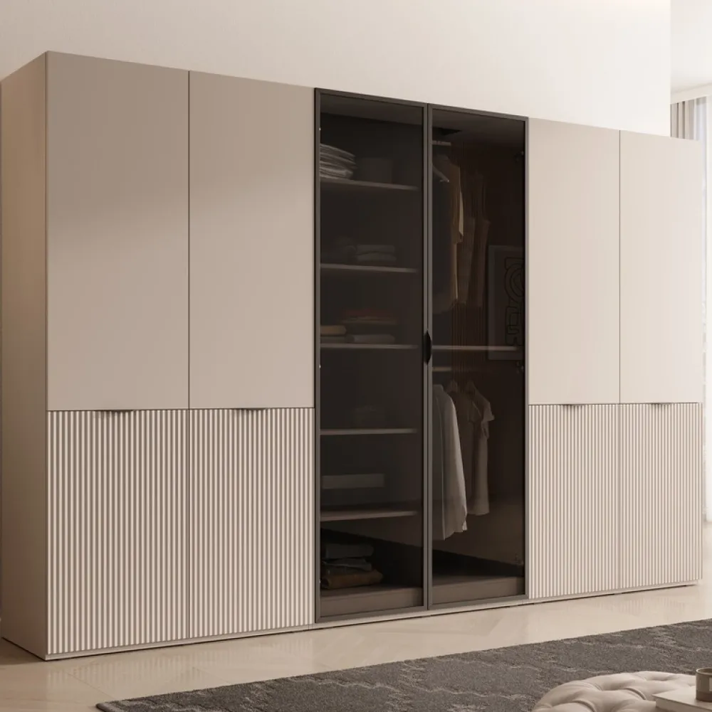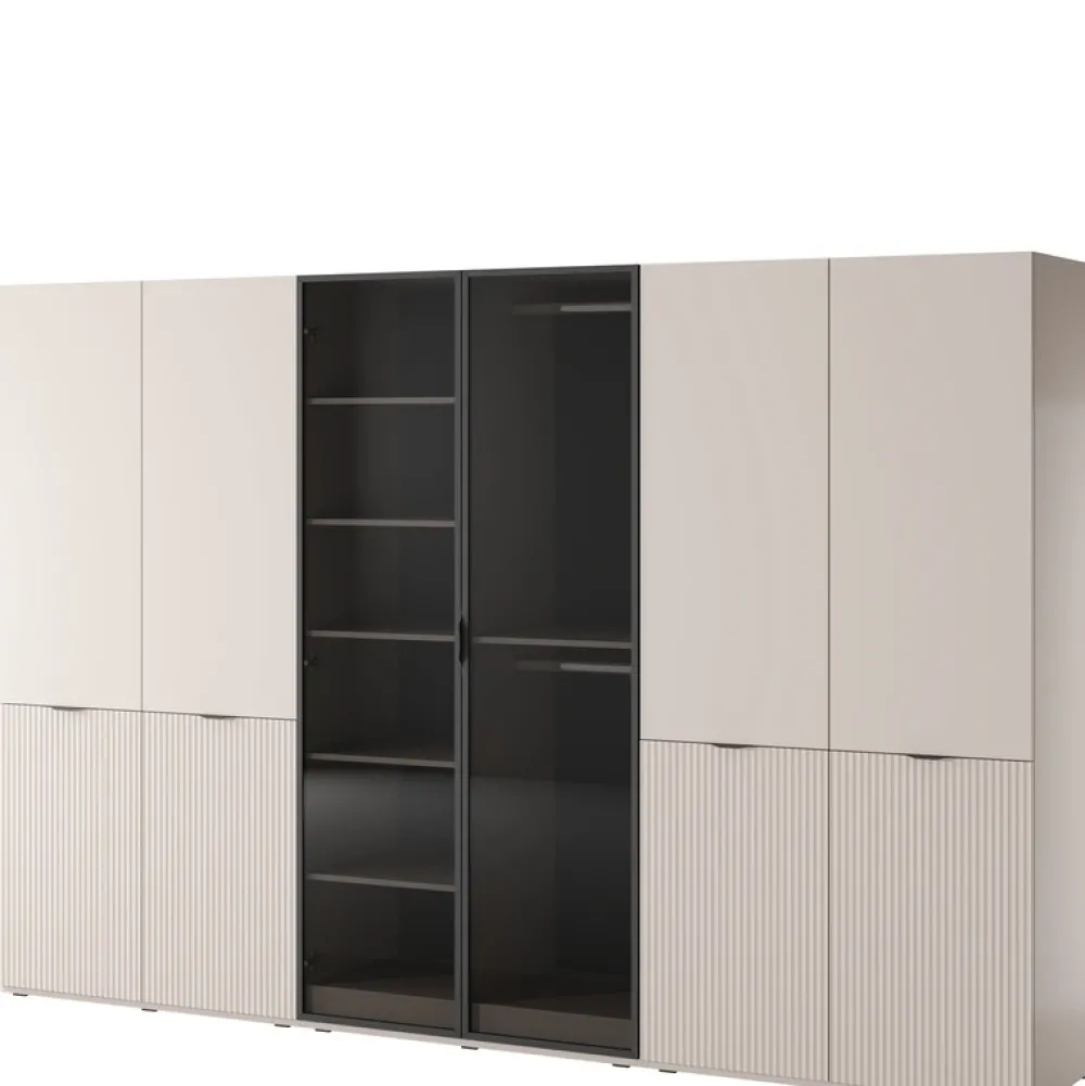 - Zestaw szaf SIGMA 3×101 cm z frezowanymi i przeszklonym frontem to aż 18 półek, 6 drążków, cichy domyk i system push to open. Kaszmir, czarna rama i modularna budowa tworzą elegancką i praktyczną przestrzeń do przechowywania. Zestaw idealny do garderoby.