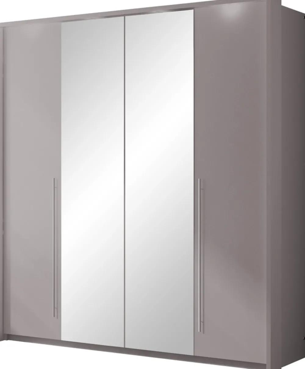 - Szafa BRAND posiada cztery drzwi z harmonijkowym systemem otwierania, za którymi znajdują się liczne półki oraz dwa aluminiowe drążki na wieszaki. Srebrne aluminiowe uchwyty dodają szafie eleganckiego akcentu. Obrzeża wykończone PCV.