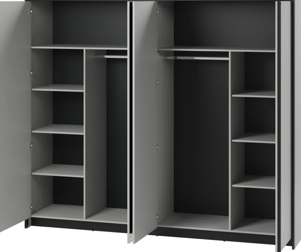 - Czterodrzwiowa szafa do sypialni o szerokości 250 cm GRIS. Wyposażona jest w aż 12 półek, 2 drążki na ubrania oraz oświetlenie LED. Szafa do sypialni posiada dwoje drzwi z lustrem. Wykonana została z płyty laminowanej 16 mm. Drzwi z cichym domykiem.
