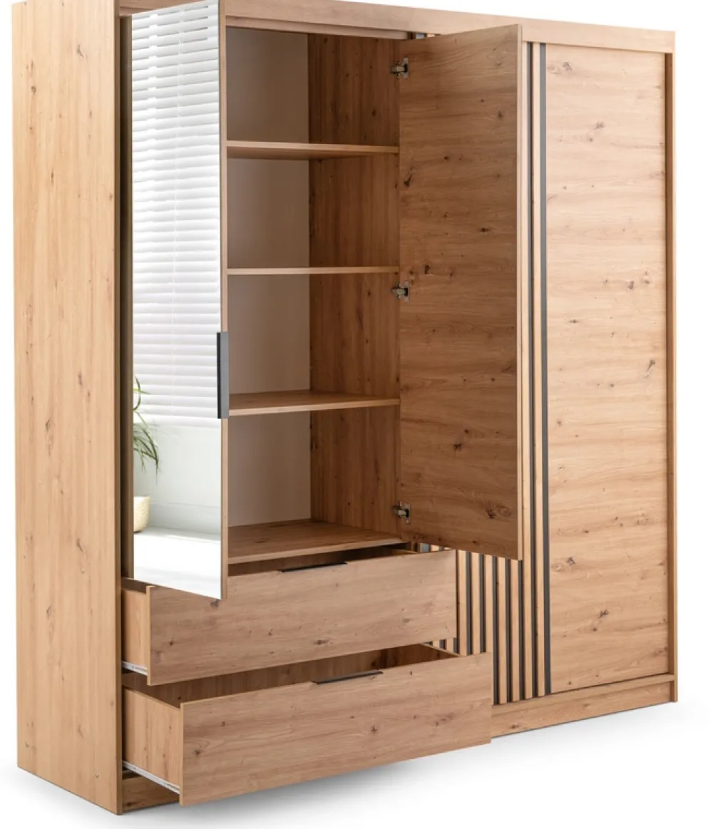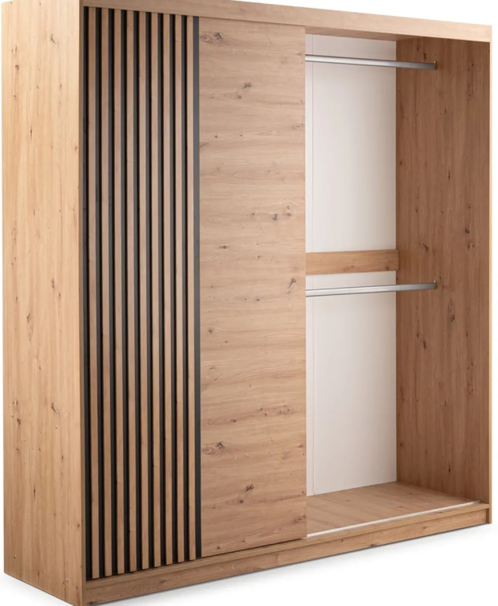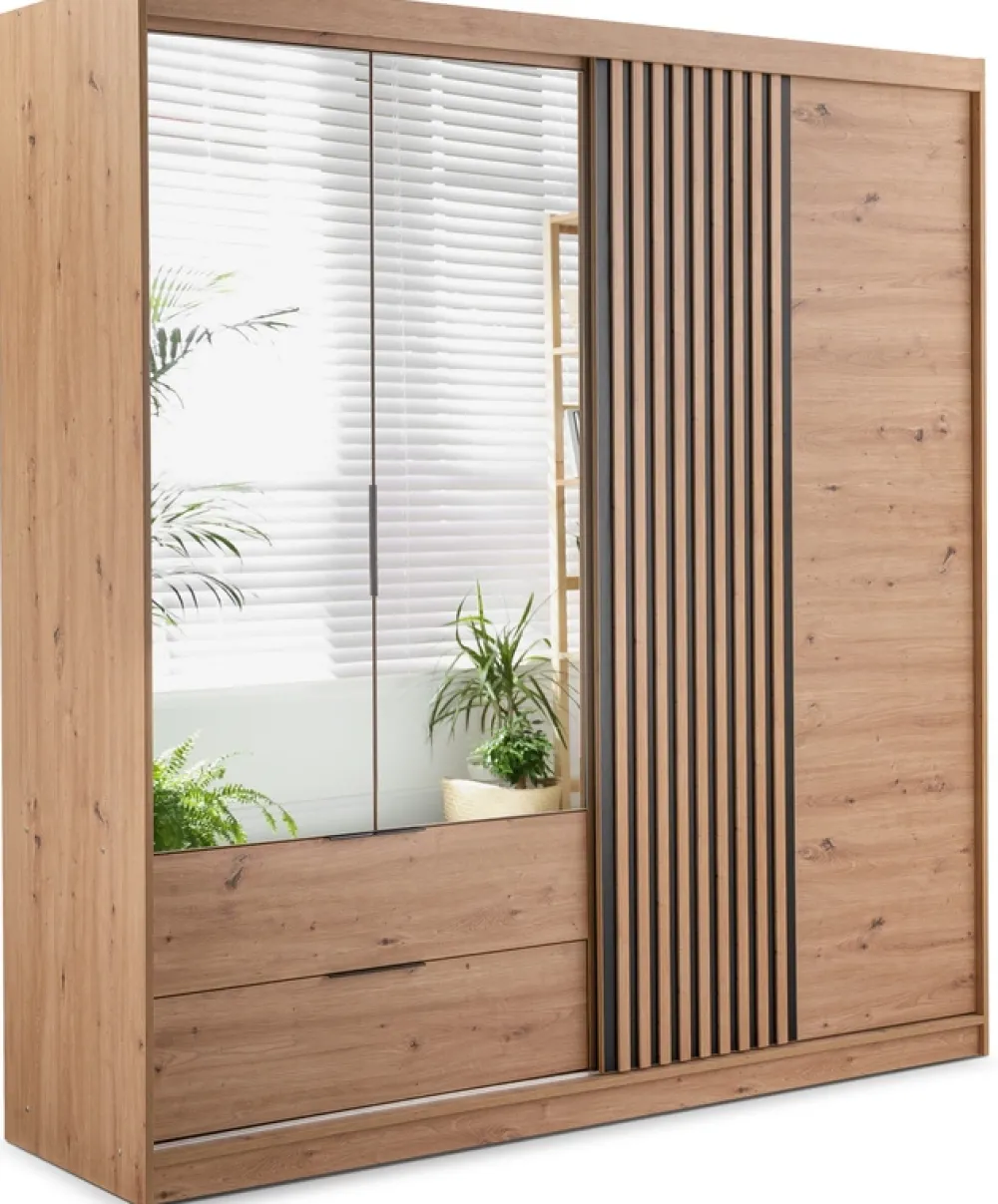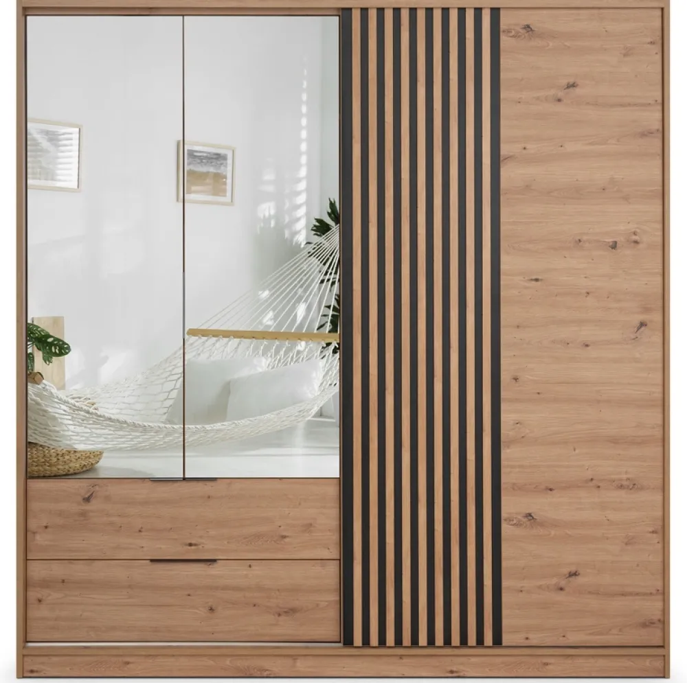 - Szafa przesuwna MISTRAL 203 cm dąb artisan z lustrem, lamelami i czarnymi uchwytami. Posiada 2 drzwi otwierane, drzwi przesuwne, dwie szuflady, półki i drążki. Nowoczesny design i duża pojemność. Idealna do sypialni