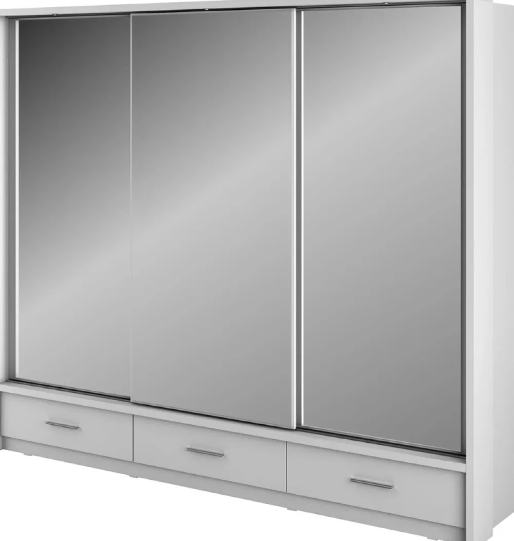 - Szafa przesuwna z lustrem 250 cm ARTI posiada troje drzwi, za którymi znajdują się dwa drążki na wieszaki i półki. U dołu szafy zastosowano trzy pojemne szuflady osadzone na prowadnicach rolkowych. Szafa przesuwna z lustrem posiada oświetlenie LED.