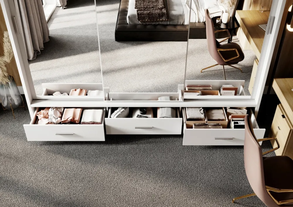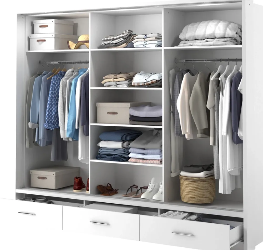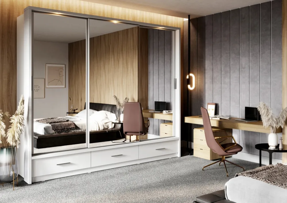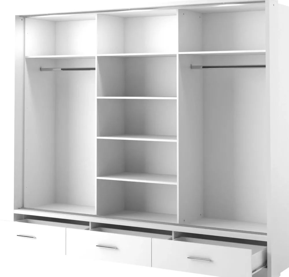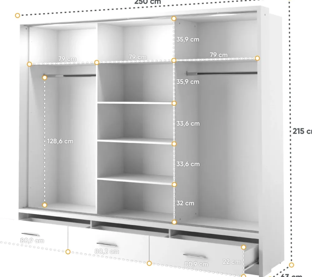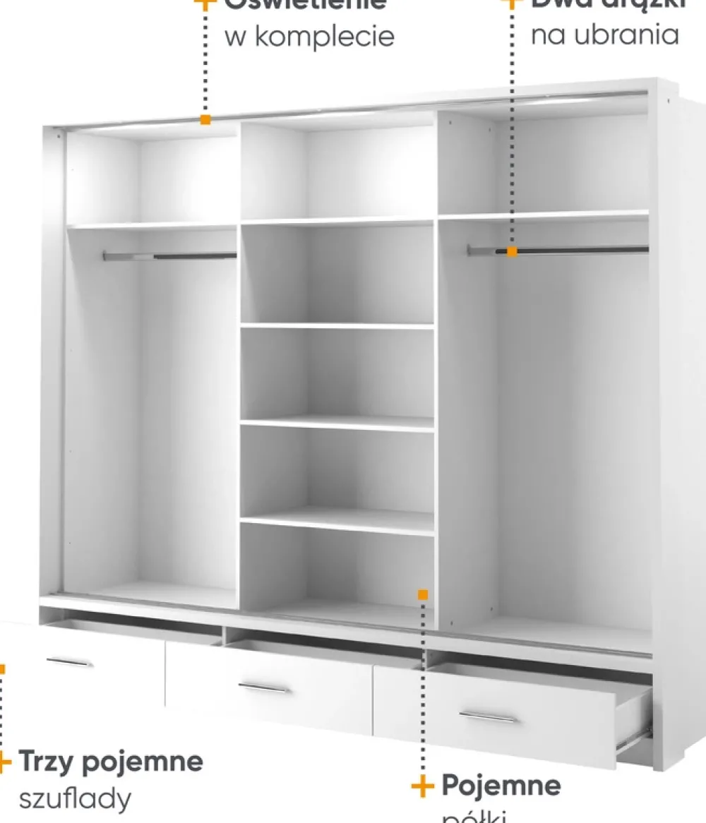 Na dole szafy przesuwnej ARTI znajdują się trzy przestronne szuflady, które zapewniają dodatkowe miejsce na przechowywanie ubrań, pościeli lub innych przedmiotów, które chcesz mieć pod ręką. Wnętrze szafy zostało starannie zaprojektowane z myślą o optymalnym wykorzystaniu przestrzeni – znajdziesz tam dwa drążki na ubrania, idealne do zawieszania płaszczy, koszul i sukienek, oraz zestaw funkcjonalnych półek, które pomogą w organizacji odzieży i akcesoriów.
