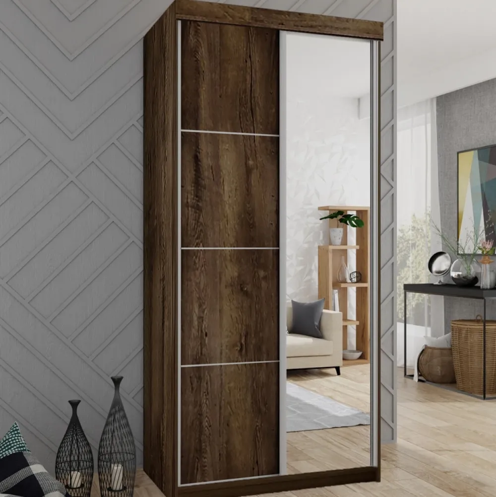 - Szafa przesuwna TARO 100 cm w kolorze jesion ciemny z dużymi lustrami. Wykonana z płyty laminowanej 16 mm. Pojemne półki i drążek zapewniają wygodne przechowywanie, a system drzwi przesuwnych i kompaktowe wymiary sprawdzą się w małych pomieszczeniach.