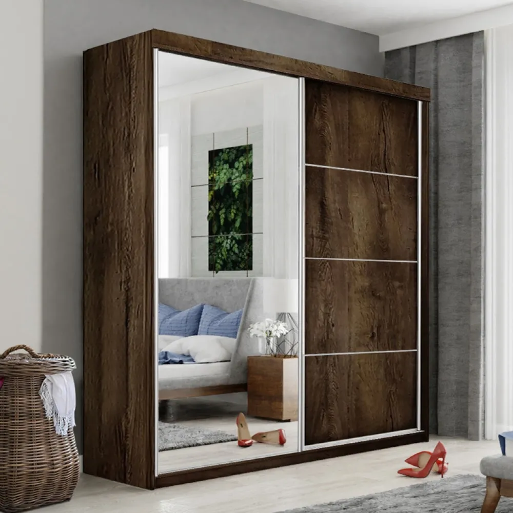 - Szafa przesuwna do sypialni TARO 150×200×62 cm w dekorze dąb jesion ciemny. Wykonana z płyty laminowanej16 mm z lustrzanymi frontami. Wyposażona w aluminiowe prowadnice, krawędzie PCV . Wnętrze z półkami i drążkiem zapewnia optymalną organizację ubrań.