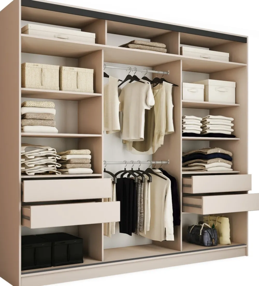 Metalowy system przesuwny zapewnia niezawodne i bezproblemowe otwieranie drzwi. To rozwiązanie, które łączy w sobie trwałość i elegancję, idealnie wpisując się w nowoczesny design szafy. Dzięki temu systemowi drzwi przesuwają się lekko i płynnie, co gwarantuje komfort użytkowania każdego dnia.