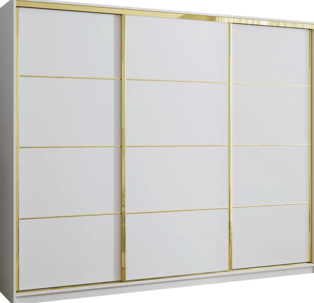 Wprowadź do swojego wnętrza elegancję i perfekcyjny porządek dzięki szafie przesuwnej o szerokości 250 cm. To mebel stworzony z myślą o praktycznym przechowywaniu, ale z wyraźnym akcentem estetycznym. Złoty stalowy system przesuwny oraz subtelne złote szprosy nadają szafie nowoczesnego, luksusowego charakteru, który doskonale wpisuje się w modne aranżacje wnętrz.