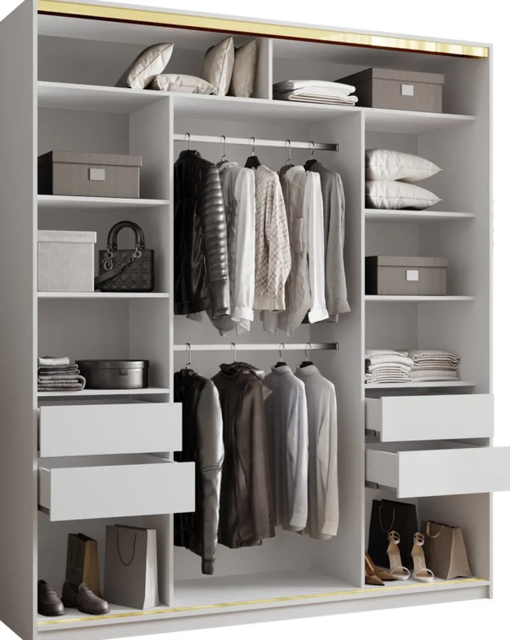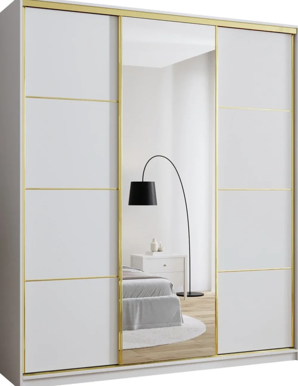 Wykończenie w kolorze złota to propozycja dla tych, którzy szukają nowoczesnego designu z nutą elegancji. Połączenie funkcjonalności i estetyki sprawia, że szafa idealnie wpisuje się zarówno w styl glamour, jak i minimalistyczne aranżacje.