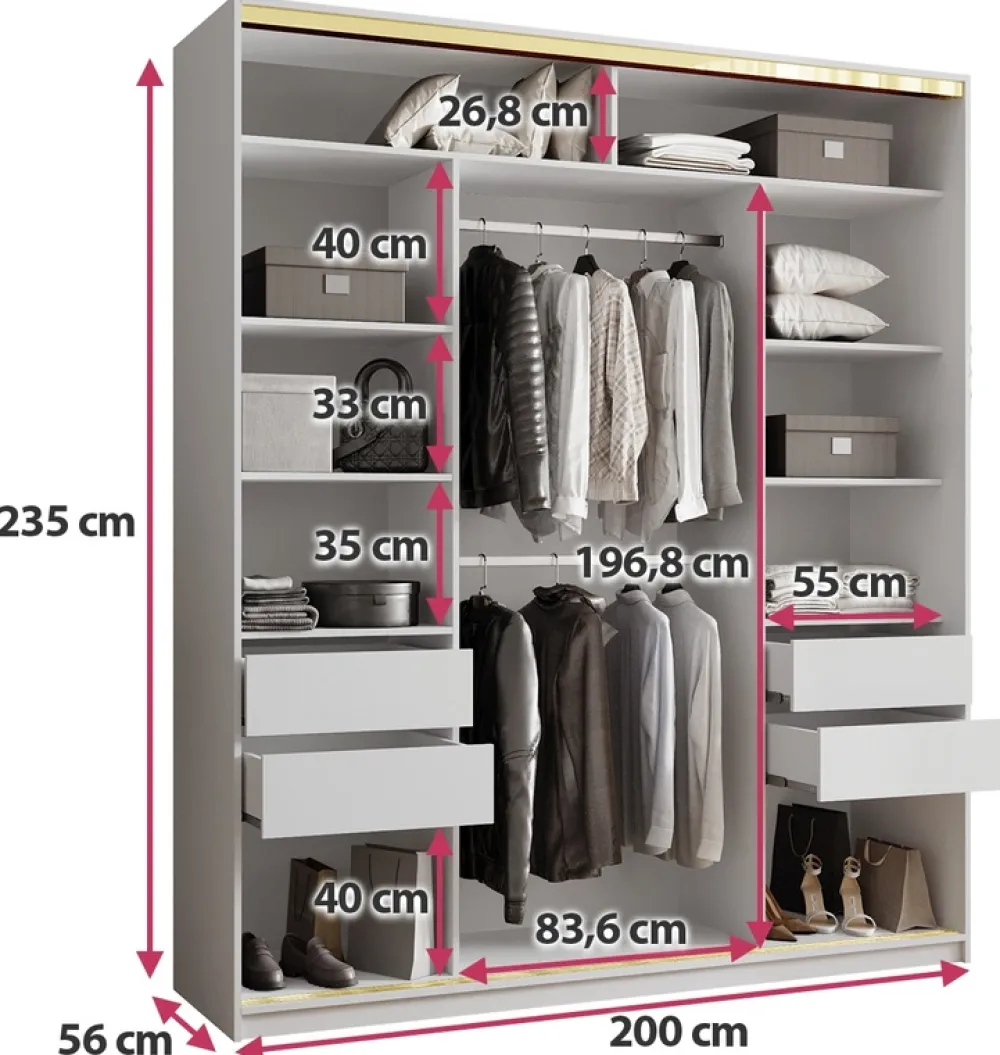 Dzięki wysokości aż 235 cm szafa oferuje wyjątkowo dużo miejsca, bez kompromisów w zakresie funkcjonalności. Dobrze rozplanowane wnętrze pozwala na logiczne uporządkowanie garderoby – od bielizny po płaszcze. Dwa aluminiowe drążki umożliwiają wygodne zawieszenie odzieży, chroniąc ją przed zagnieceniami.