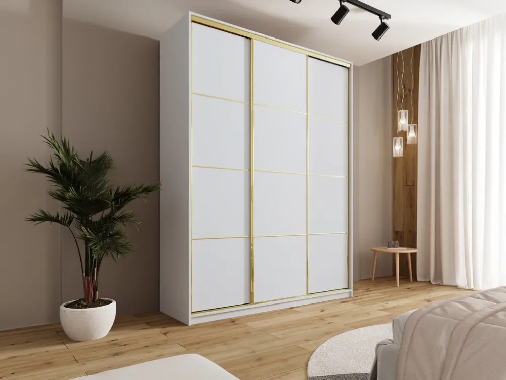 Wykończenie w kolorze złota to propozycja dla tych, którzy szukają nowoczesnego designu z nutą elegancji. Połączenie funkcjonalności i estetyki sprawia, że szafa idealnie wpisuje się zarówno w styl glamour, jak i minimalistyczne aranżacje.