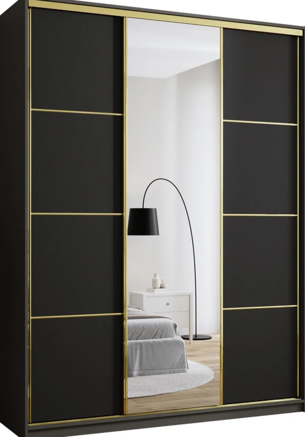 Wykończenie w kolorze złota to propozycja dla tych, którzy szukają nowoczesnego designu z nutą elegancji. Połączenie funkcjonalności i estetyki sprawia, że szafa idealnie wpisuje się zarówno w styl glamour, jak i minimalistyczne aranżacje.