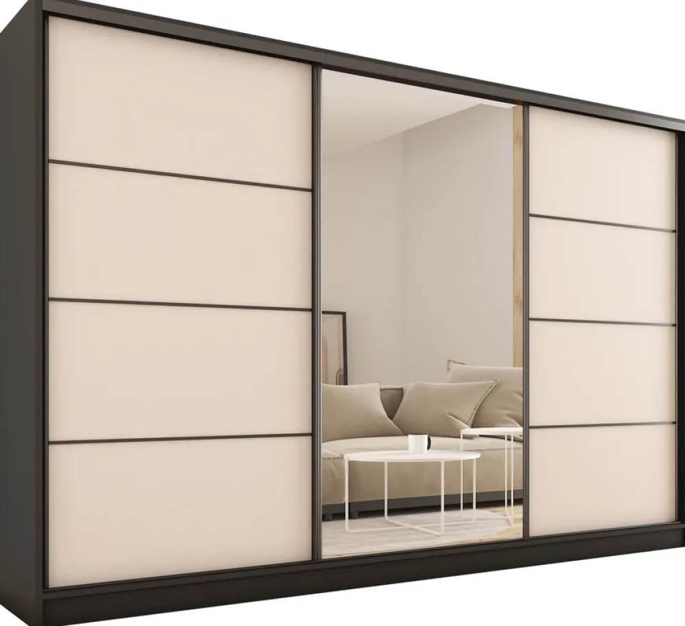 - Nowoczesna szafa przesuwna LOFT o szerokości 280 cm, z korpusem w kolorze czarnym i frontami w wybarwieniu beż piaskowy. Wyposażona w lustro, cztery szuflady, sześć półek oraz dwa drążki na wieszaki. Wykonana z płyty laminowanej o grubości 16 mm.