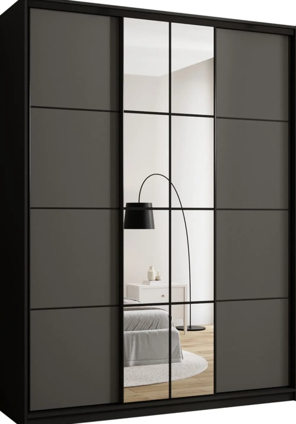 Szafa przesuwna o szerokości 180 cm to doskonałe rozwiązanie dla osób, które potrzebują dużej przestrzeni do przechowywania, nie rezygnując przy tym z nowoczesnego designu. Wyposażona w stalowy system przesuwny w eleganckim czarnym kolorze, szafa zapewnia płynne otwieranie i zamykanie drzwi, a jej minimalistyczny wygląd świetnie wpisuje się w modne aranżacje wnętrz.