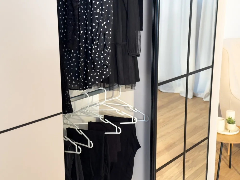 - Szafa posiada dwa aluminiowe drążki na wieszaki. Celowo nie wykonujemy wierceń pod drążki na wieszaki, tak aby każdy mógł dostosować ich wysokość do własnych potrzeb.