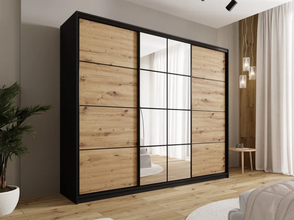 Szafa posiada trzy drzwi przesuwne wykonane na solidnym stalowym systemie w eleganckim czarnym kolorze. Czarne stalowe uchwyty dodają meblowi nowoczesnego charakteru, jednocześnie zapewniając trwałość i wygodę użytkowania. Przesuwne drzwi oszczędzają miejsce w pomieszczeniu, co jest szczególnie ważne w mniejszych sypialniach.