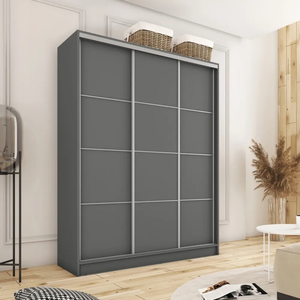 Grafitowa szafa przesuwna TOP została wykonana z wysokiej jakości płyty laminowanej o grubości 16 mm. Laminat to materiał, który charakteryzuje się wyjątkową trwałością oraz odpornością na zarysowania i wilgoć. Dzięki temu szafa jest nie tylko estetyczna, ale również niezwykle funkcjonalna i łatwa w utrzymaniu czystości. Obrzeża szafy wykończone okleiną ABS zapewniają dodatkową ochronę przed uszkodzeniami mechanicznymi, co gwarantuje długowieczność mebla.