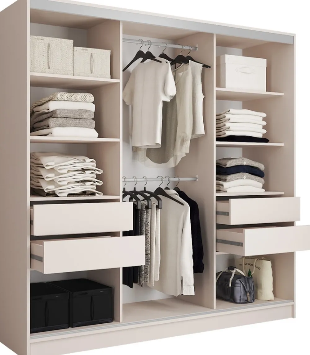 Wnętrze szafy TOP zostało zaprojektowane z myślą o maksymalnym wykorzystaniu przestrzeni. Po prawej i lewej stronie znajdują się cztery półki oraz dwie szuflady, które umożliwiają wygodne przechowywanie ubrań, bielizny i akcesoriów. Środkowa część szafy wyposażona jest w dwa metalowe drążki, które doskonale nadają się do wieszania odzieży, zapewniając jednocześnie łatwy dostęp do wszystkich rzeczy.