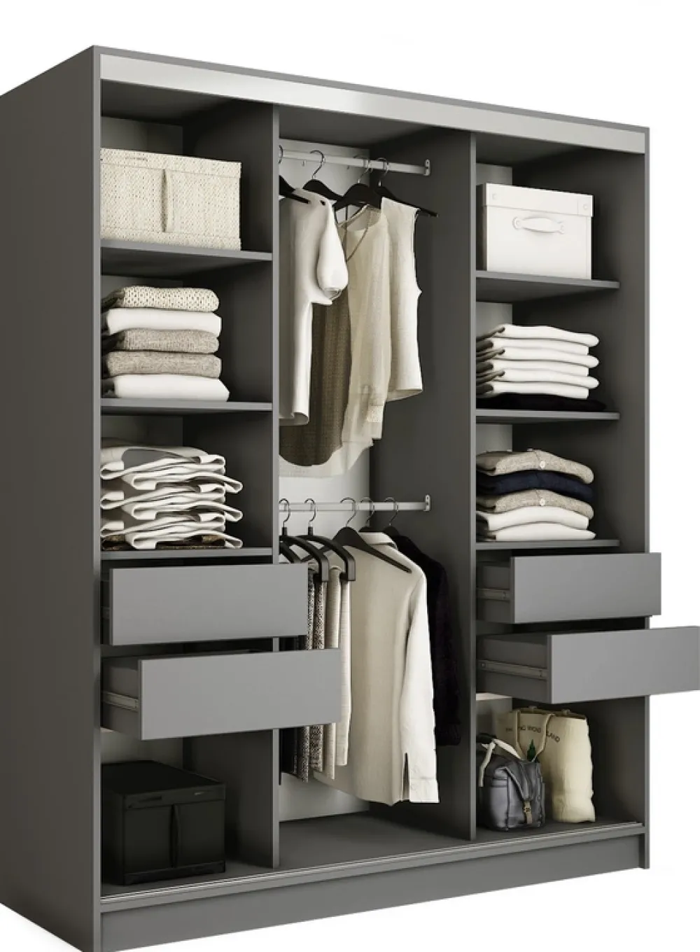 - Szafa przesuwna 150 cm TOP posiada po cztery półki i dwie szuflady z lewej i prawej strony. Za środkowymi drzwiami znajdują się dwa metalowe drążki na wieszaki. Drzwi poruszają się na stalowej prowadnicy w srebrnym kolorze.