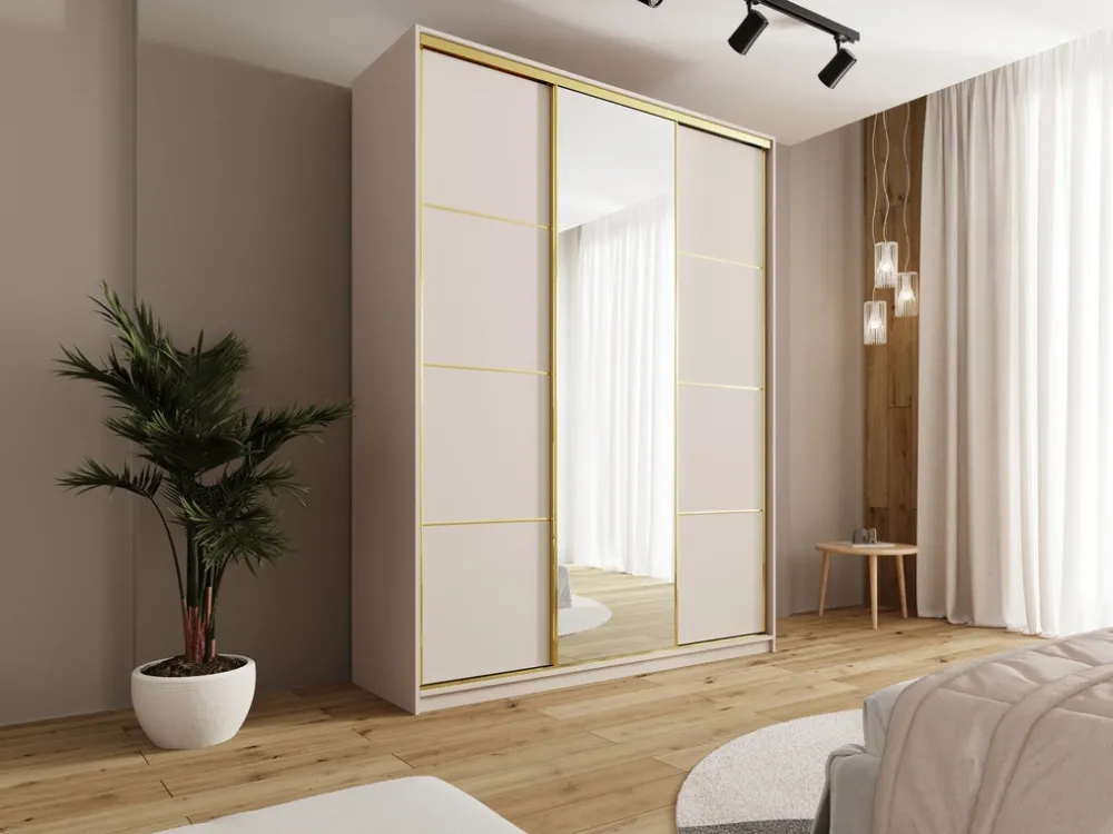 Wykończenie w kolorze złota to propozycja dla tych, którzy szukają nowoczesnego designu z nutą elegancji. Połączenie funkcjonalności i estetyki sprawia, że szafa idealnie wpisuje się zarówno w styl glamour, jak i minimalistyczne aranżacje.