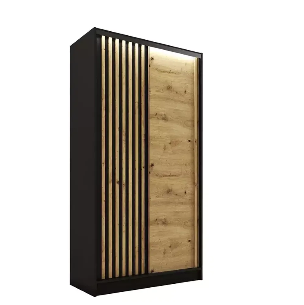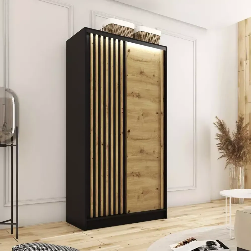 - Szafa niewyposażona w tradycyjne uchwyty, otwieranie odbywa się za pomocą listew przymocowanych do frontu.