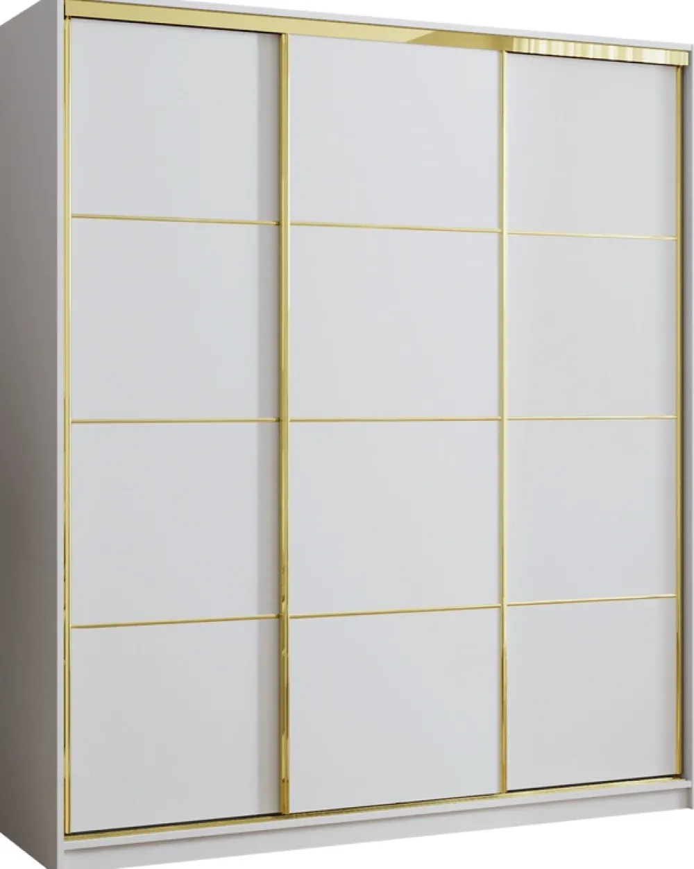 Wprowadź do swojego wnętrza elegancję i perfekcyjny porządek dzięki szafie przesuwnej o szerokości 180 cm. To mebel stworzony z myślą o praktycznym przechowywaniu, ale z wyraźnym akcentem estetycznym. Złoty stalowy system przesuwny oraz subtelne złote szprosy nadają szafie nowoczesnego, luksusowego charakteru, który doskonale wpisuje się w modne aranżacje wnętrz.