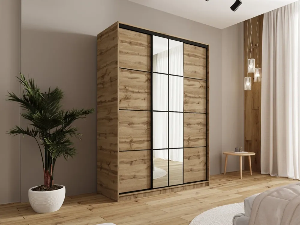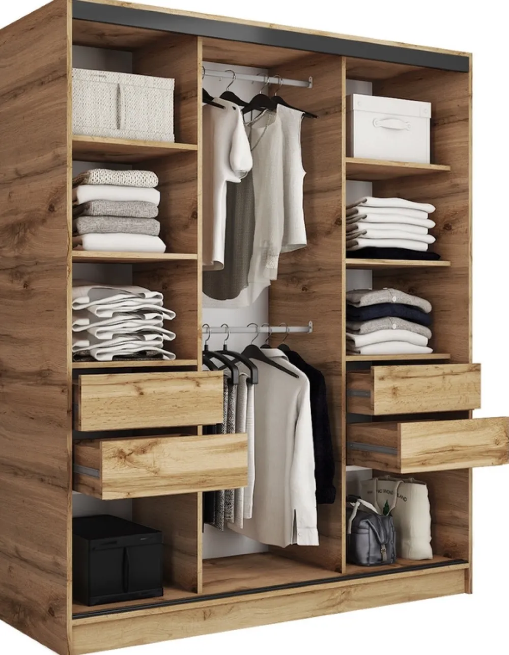 Wykonana z wysokiej jakości materiałów, ta szafa przesuwna z lustrem to nie tylko funkcjonalny mebel, ale również stylowy element wnętrza. Dzięki połączeniu przemyślanego układu półek, szuflad i drążków z eleganckim wykończeniem, stanowi idealny wybór dla osób poszukujących praktycznych i estetycznych rozwiązań w aranżacji wnętrz. Nowoczesna szafa pozwoli Ci zorganizować przestrzeń, nadając pomieszczeniu wyjątkowego charakteru.