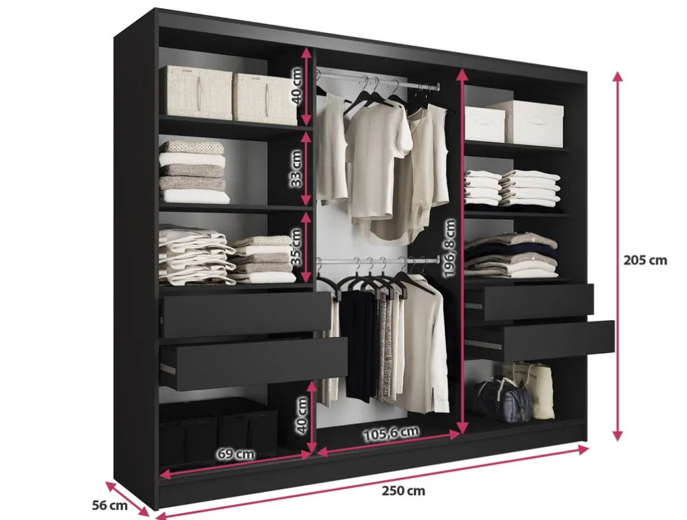 Oferowana szafa ma szerokość 250 cm, co zapewnia przestronność i dużą ilość miejsca na przechowywanie ubrań oraz innych przedmiotów. Jej rozmiary i funkcjonalność czynią ją idealnym wyborem dla osób ceniących sobie zarówno estetykę, jak i praktyczne rozwiązania w organizacji domowego wnętrza.