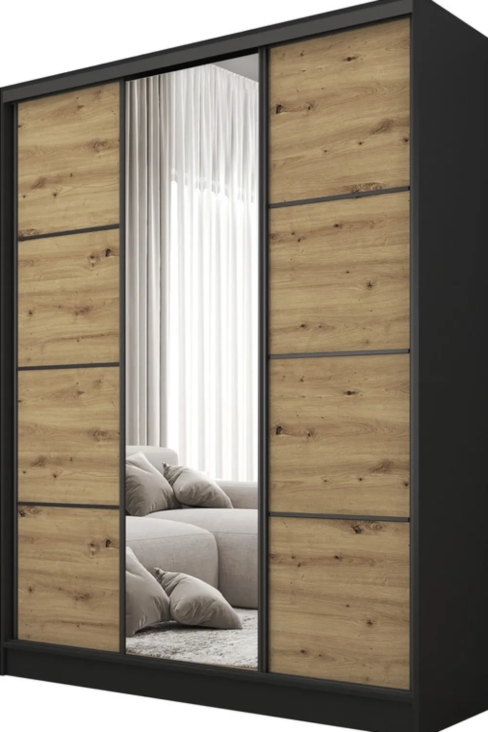 - Szafa przesuwna z lustrem 150 cm BEST posiada lustro umieszczone na centralnych drzwiach, które optycznie powiększa, oraz rozjaśnia pomieszczenie. Wewnątrz znajduje się osiem półek, cztery szuflady oraz dwa drążki na wieszaki.