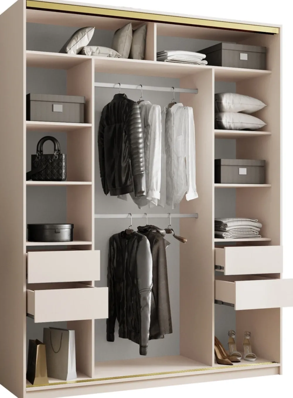 Dzięki wysokości aż 235 cm szafa oferuje wyjątkowo dużo miejsca, bez kompromisów w zakresie funkcjonalności. Dobrze rozplanowane wnętrze pozwala na logiczne uporządkowanie garderoby – od bielizny po płaszcze. Dwa aluminiowe drążki umożliwiają wygodne zawieszenie odzieży, chroniąc ją przed zagnieceniami.