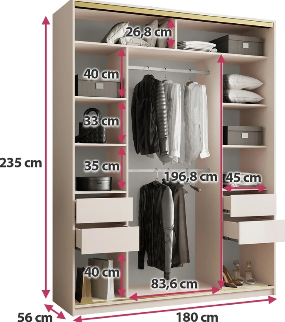 - Szafa przesuwna 180 cm GOLD NEW MAX charakteryzuje się swoją wysokością 235 cm, dzięki czemu jest niezwykle pojemna. Szafa posiada trzy drzwi osadzone na stalowym systemie przesuwnym, liczne półki, cztery pojemne szuflady i dwa drążki.