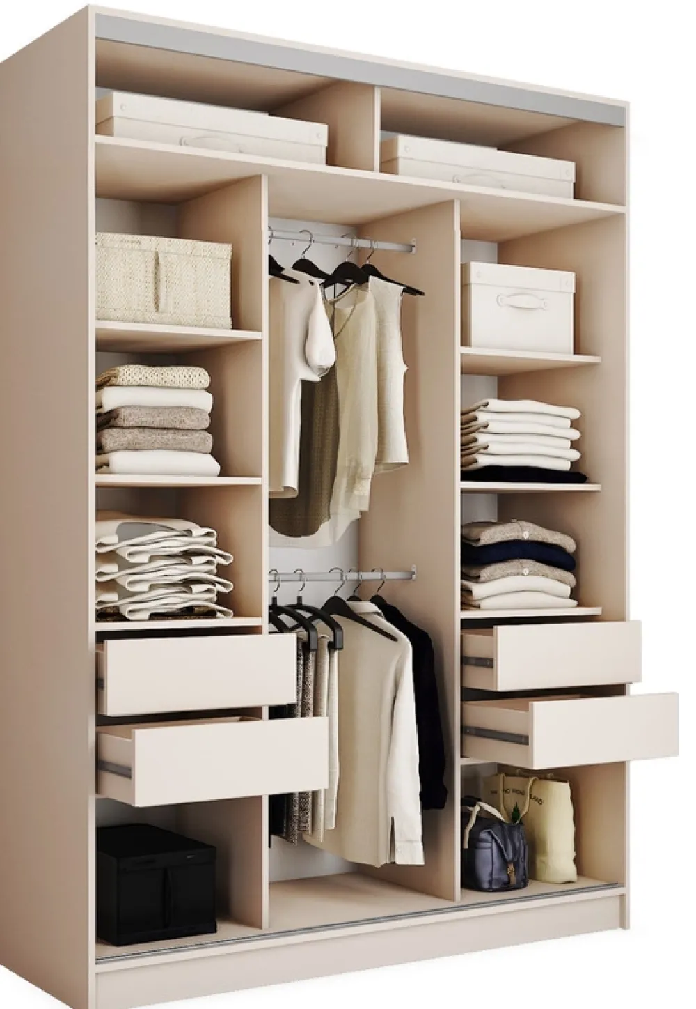 Szafa przesuwna do sypialni TOP MAX została zaprojektowana z myślą o maksymalnej wygodzie użytkowania. W górnej części znajduje się półka podzielona na dwie części, która idealnie nadaje się do przechowywania większych przedmiotów, takich jak pościel czy sezonowe ubrania. Po lewej i prawej stronie szafy znajdują się cztery przestronne półki oraz dwie praktyczne szuflady. Szuflady poruszają się na prowadnicach kulkowych, co zapewnia ich płynne i ciche otwieranie, a także wygodny dostęp do przechowywanych w nich rzeczy.