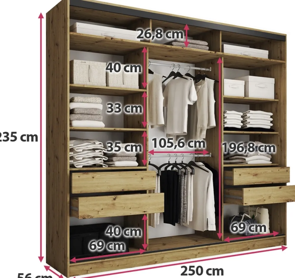 - Szafa przesuwna 250 cm EDGE MAX jest bardzo pojemnym rozwiązaniem dla nowoczesnej sypialni. Szafa charakteryzuje się swoją wysokością 235 cm, która obejmuje wiele półek na ubrania, cztery szuflady oraz dwa aluminiowe drążki na wieszaki.